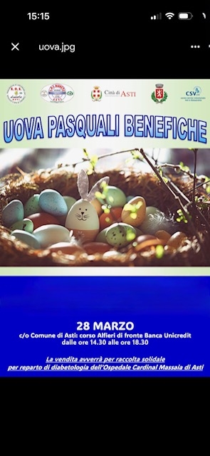 Dopo Villanova d'Asti Sabato 28/03 dalle 14.30 alle ore 18.30 la nostra associazione sara' in Corso Alfieri di fronte alla banca UNicredit per la vendita delle uova solidali, per una raccolta fondi per il reparto di diabetologia dell'Ospedale Cardinal Massaia di Asti.